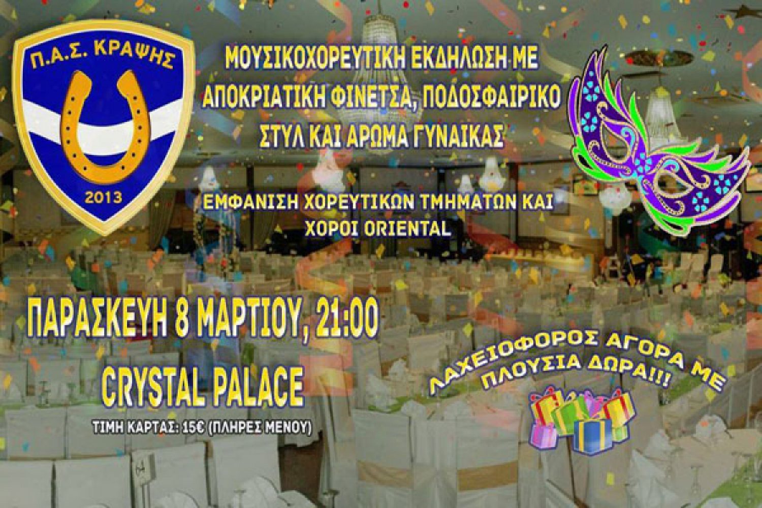 Αποκριάτικη μουσικοχορευτική εκδήλωση διοργανώνει την Παρασκευή 8 Μαρτίου (21:00) στο CRYSTAL PALACE ο ΠΑΣ Κράψης.