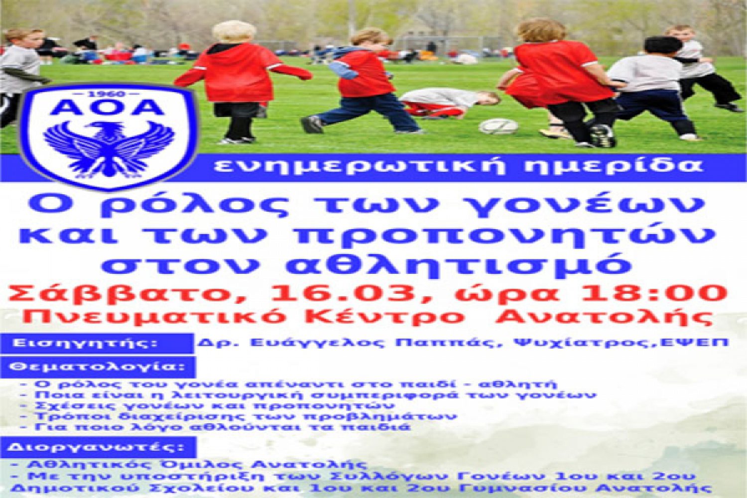 Ο Αθλητικός Όμιλος Ανατολής διοργανώνει ενημερωτική εκδήλωση με τίτλο Ο ρόλος των γονέων και των προπονητών στον αθλητισμό.