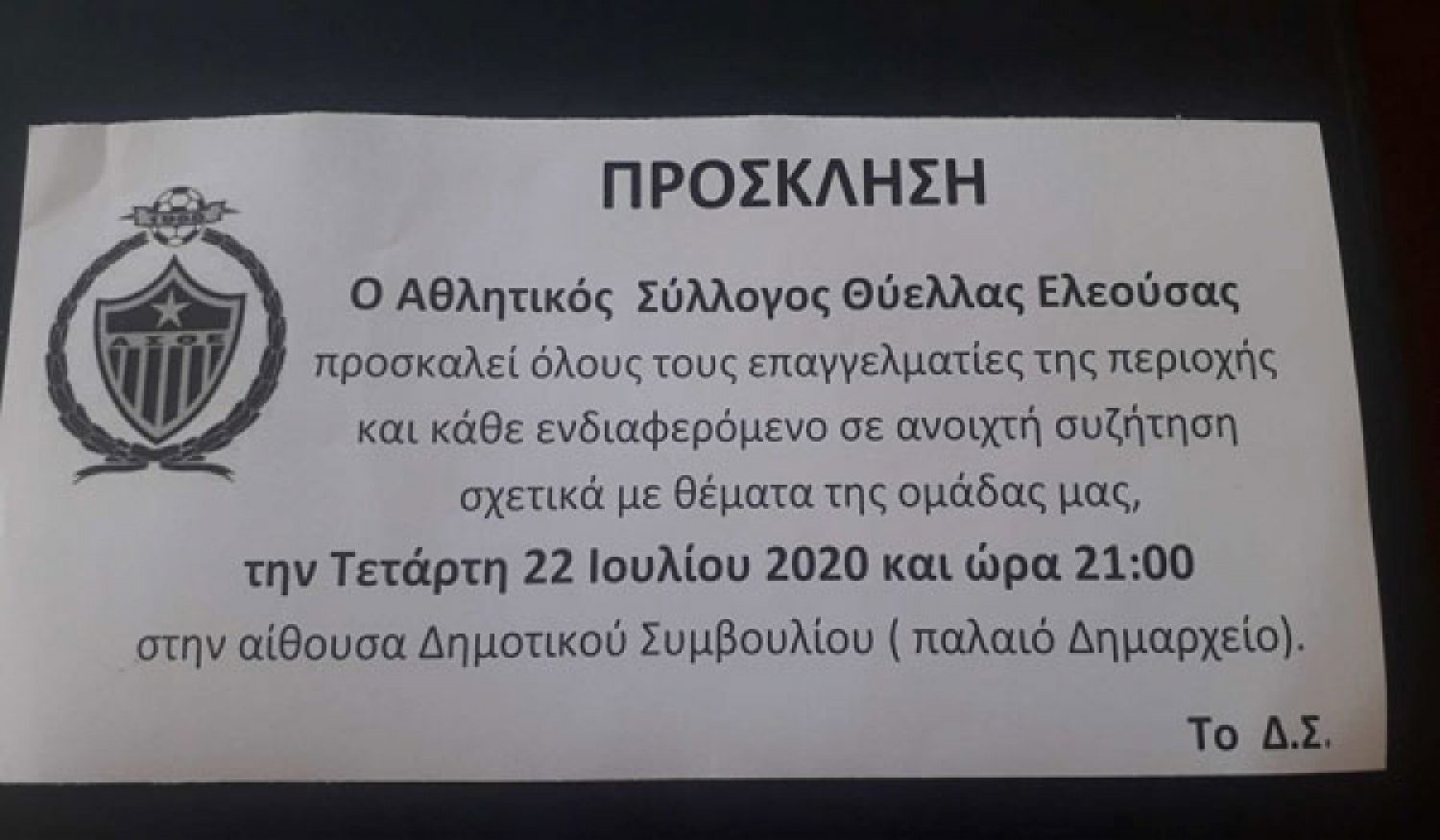 Σε μια κίνηση που δεν μας έχουν συνηθίσει τα ερασιτεχνικά σωματεία προέβη σήμερα η Διοίκηση της Ελεούσας η οποία προσκαλεί τους επαγγελματίες της περιοχής και κάθε ενδιαφερόμενο σε ανοιχτή συζήτηση για την ομάδα την Τετάρτη 22 Ιουλίου και ώρα 21:00 στην αίθουσα του Δημοτικού Συμβουλίου στο παλιό Δημαρχείο.