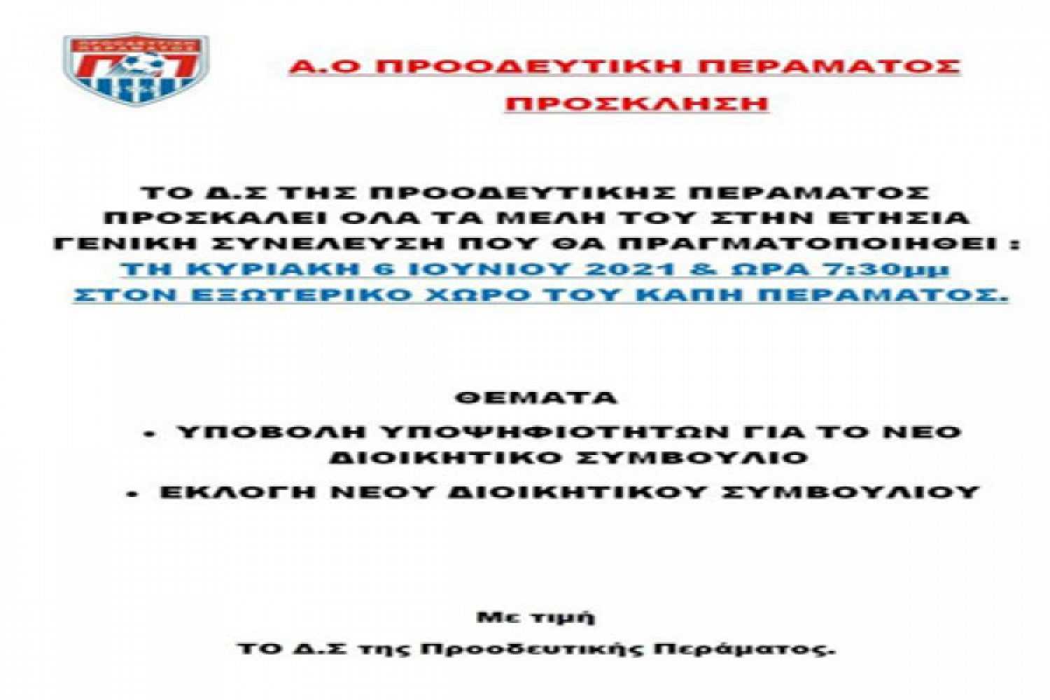Την Κυριακή 6 Ιουνίου (19:30) στο εξωτερικό χώρο του ΚΑΠΗ Περάματος θα πραγματοποιηθεί η ετήσια Γενική Συνέλευση της Προοδευτικής Περάματος,