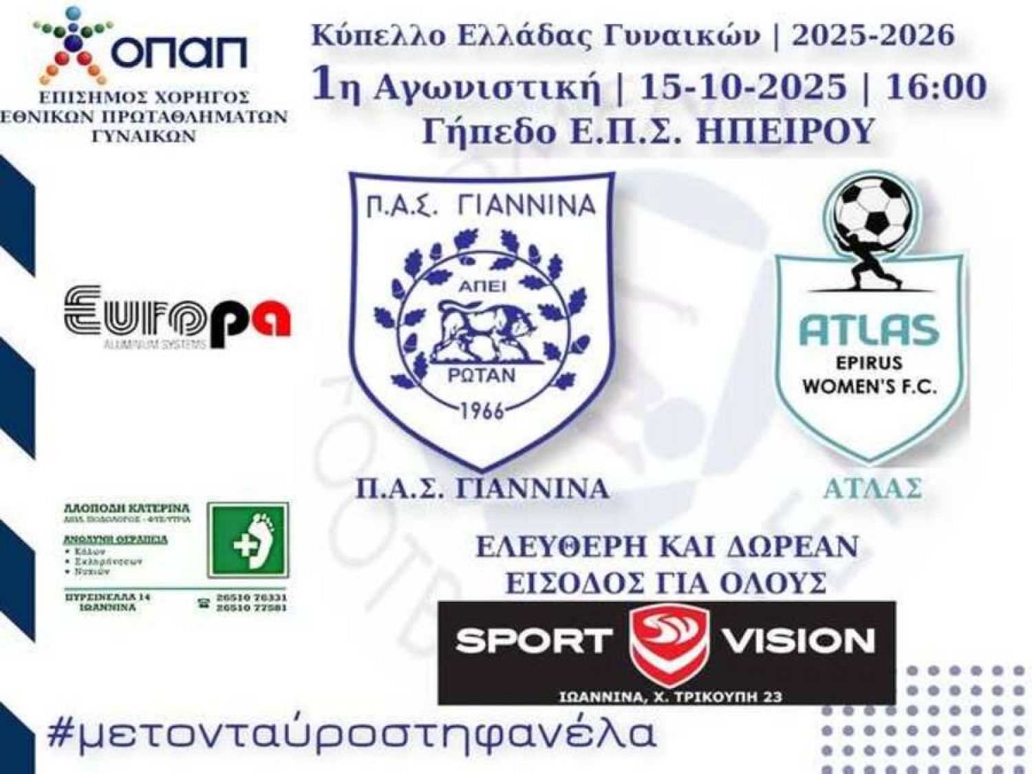 Γιαννιώτικη «μονομαχία» σήμερα στο Κύπελλο Ελλάδος Γυναικών, καθώς ο ΠΑΣ Γιάννινα αντιμετωπίζει τον Άτλαντα στις 16.00 στο γήπεδο της ΕΠΣ Ηπείρου.