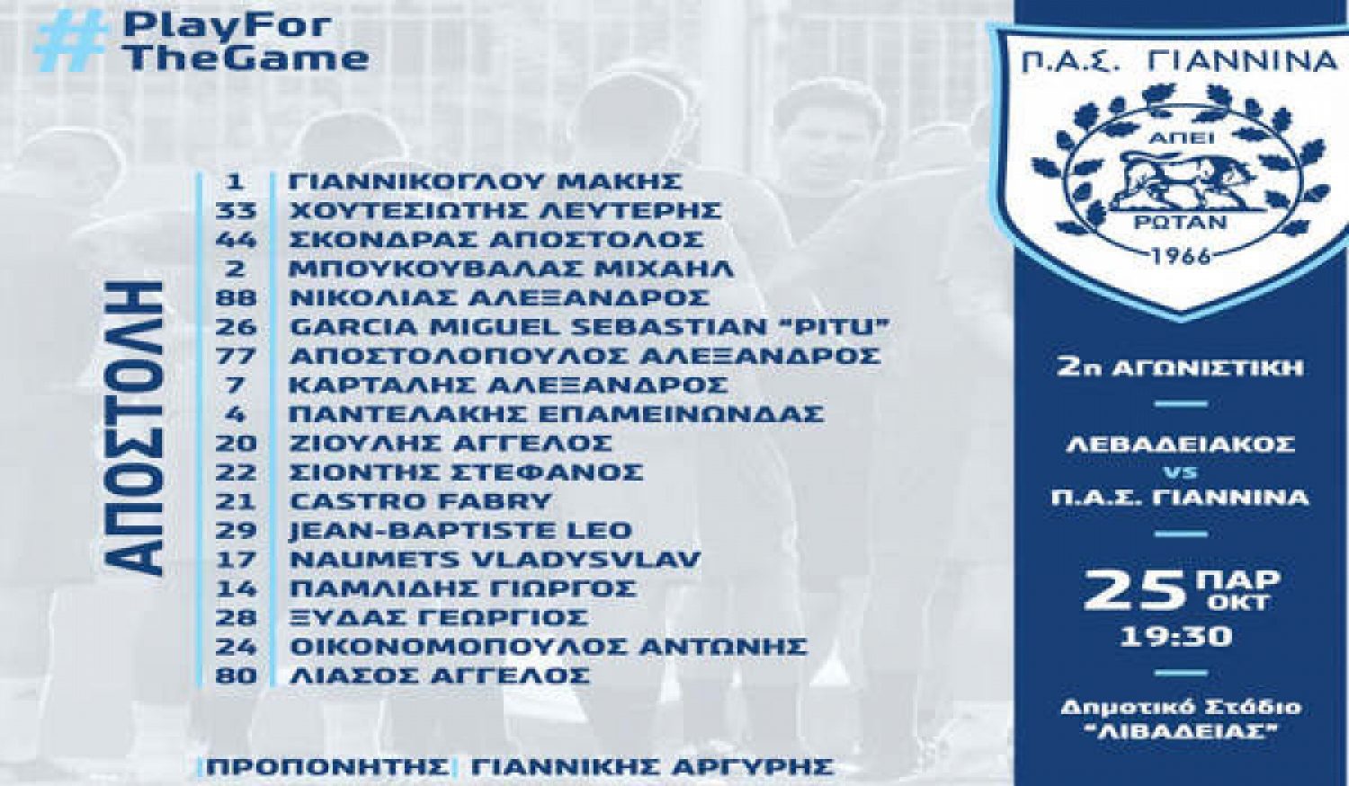 Αναλυτικά την αποστολή του ΠΑΣ αποτελούν οι: Γιαννίκογλου, Χουτεσιώτης, Σκόνδρας, Μπουκουβάλας, Νικολιάς, Πίτου Γκαρσία, Αποστολόπουλος, Καρτάλης, Παντελάκης, Ζιούλης, Σιόντης, Κάστρο, Ξύδας, Οικονομόπουλος, Λιάσος, Λέο, Νάουμετς, Παμλίδης.