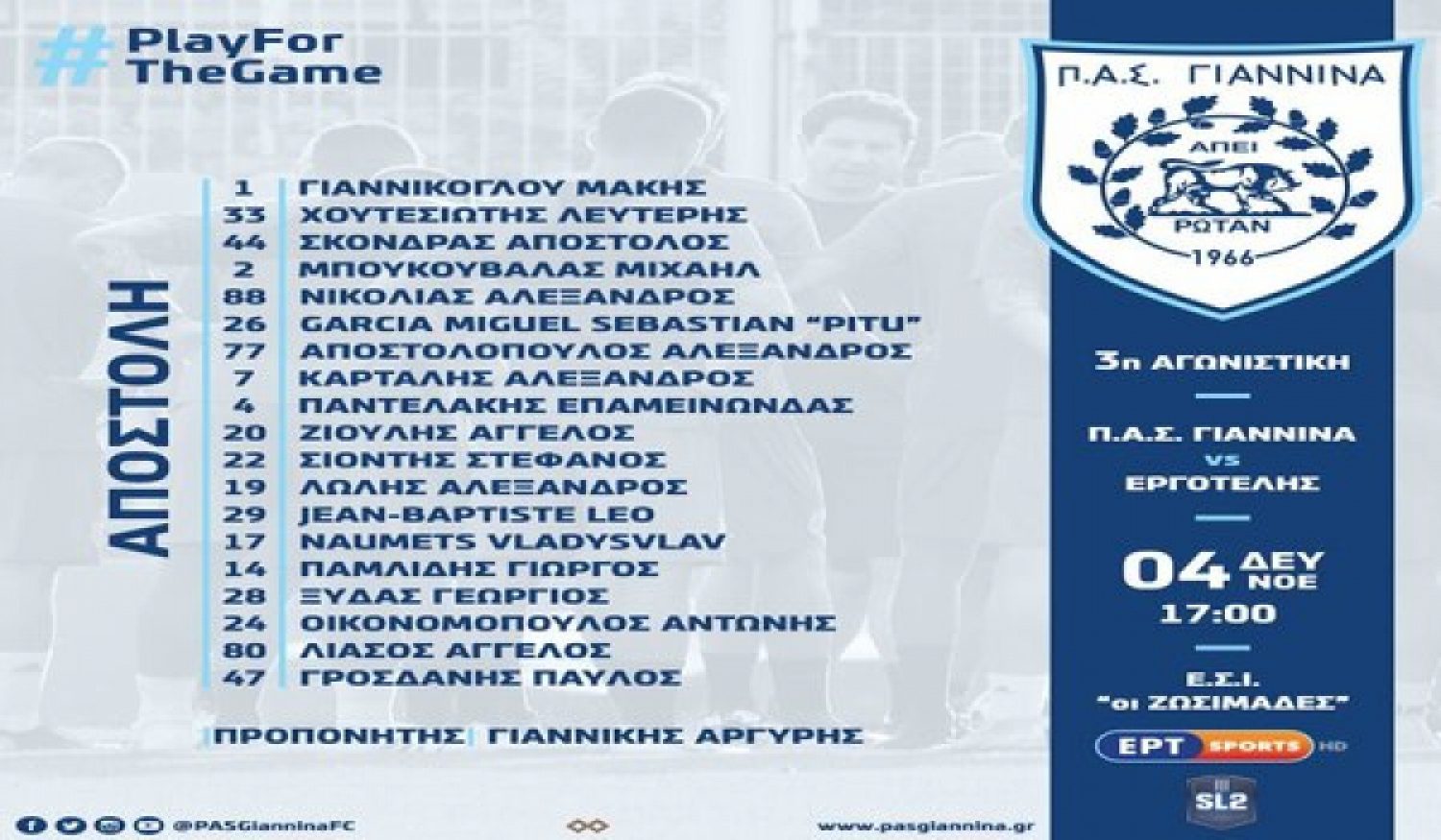 Με πέντε απουσίες θα υποδεχτεί αύριο τον Εργοτέλη στο Ζωσιμάδες ο ΠΑΣ Γιάννινα στο τελευταίο χρονικά παιχνίδι της 3ης αγωνιστικής της Super League 2 καθώς δεν θα αγωνιστούν οι Κάστρο και Κρίζμαν πέραν των γνωστών τραυματιών Σεργκελασβίλι, Ελευθεριάδη και Ράντοβατς.