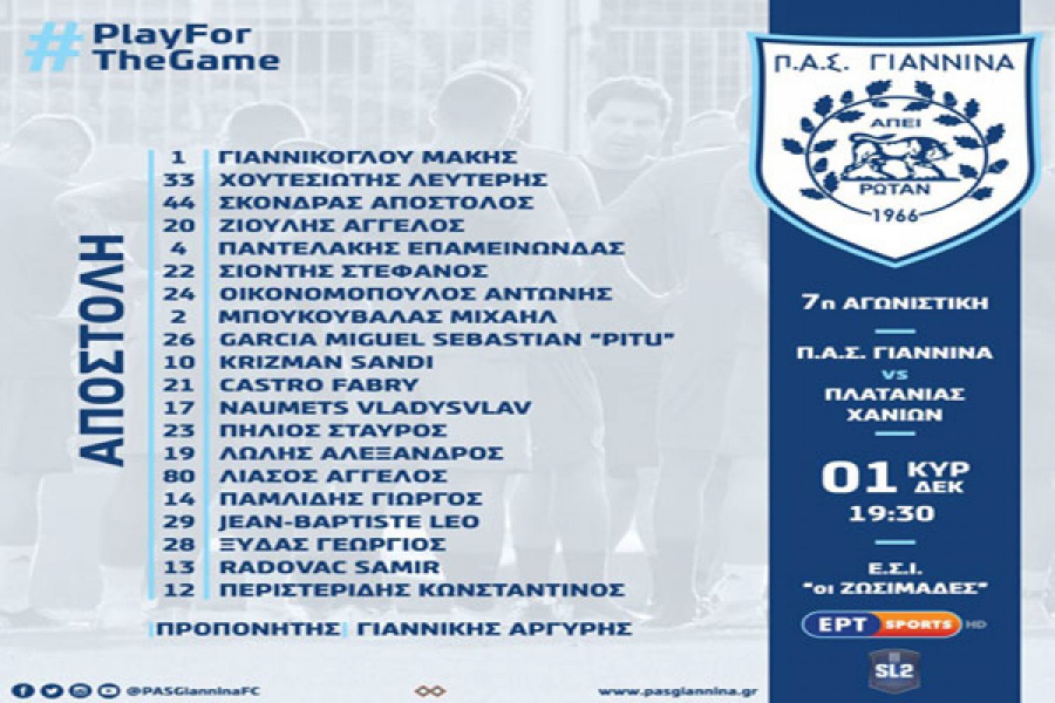 Εκτός των Αποστολόπουλου και Καρτάλη στην αποστολή δεν είναι οι τραυματίες Σεργκελαβσίλι, Νικολιάς και Ελευθεριάδης και οι Πανουργιάς,Γώγος, Βενετικίδης, Ζώγκος,