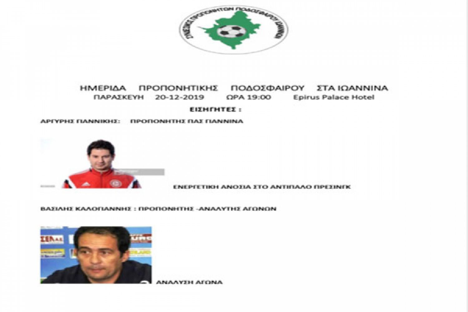 Προπονητική ημερίδα διοργανώνει την Παρασκευή 20 Δεκεμβρίου (19:00) στο Epirus Palace ο Σύνδεσμος Προπονητών Ποδοσφαίρου Ιωαννίνων στην οποία ένας εκ των εισηγητών θα είναι ο προπονητής του ΠΑΣ Γιάννινα Αργύρης Γιαννίκης.