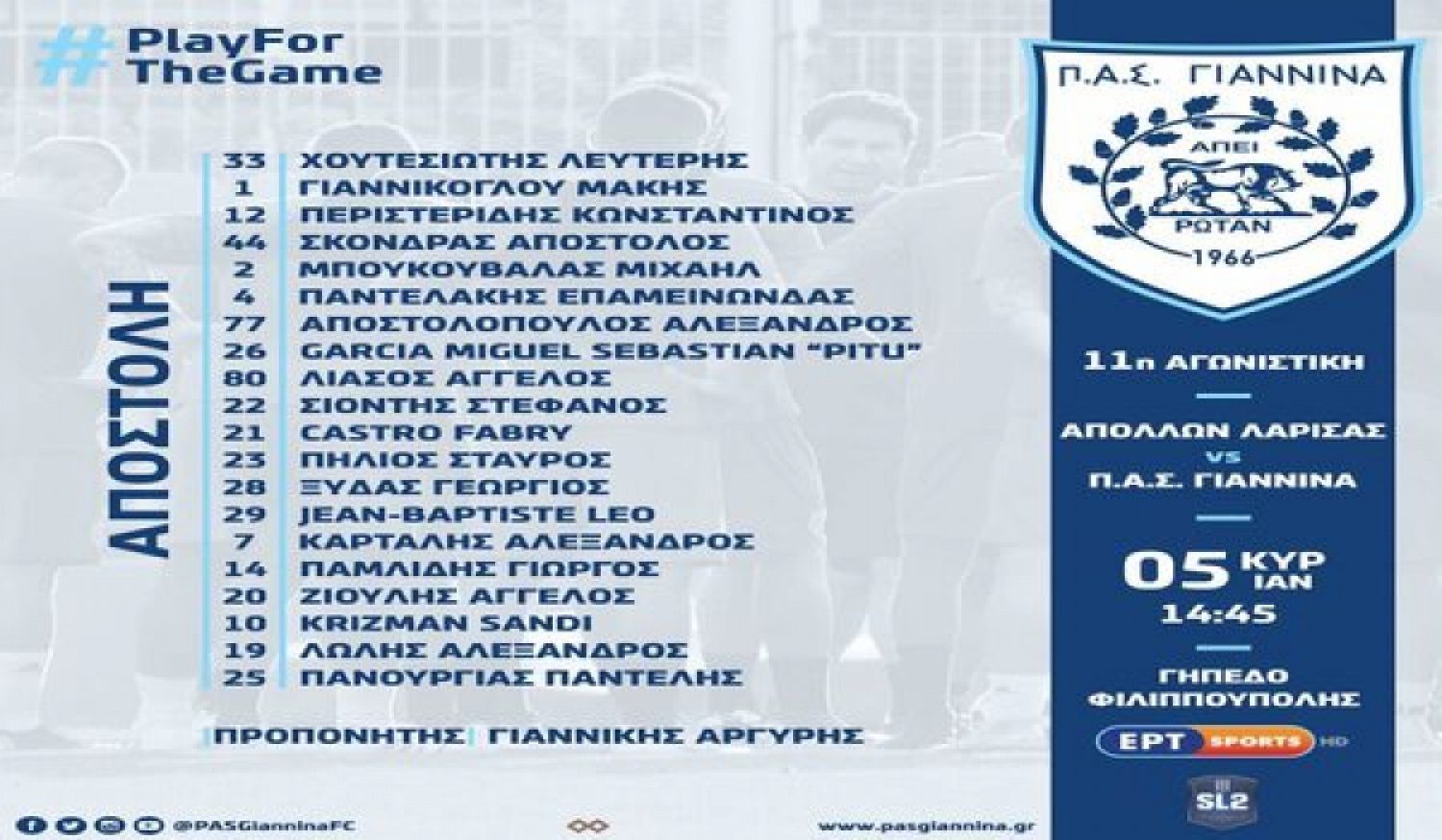 Μετά το τέλος της σημερινής προπόνησης τακτικής ο προπονητής του ΠΑΣ Γιάννινα, Αργύρης Γιαννίκης ανακοίνωσε την αποστολή που αποτελείται από τους εξής: