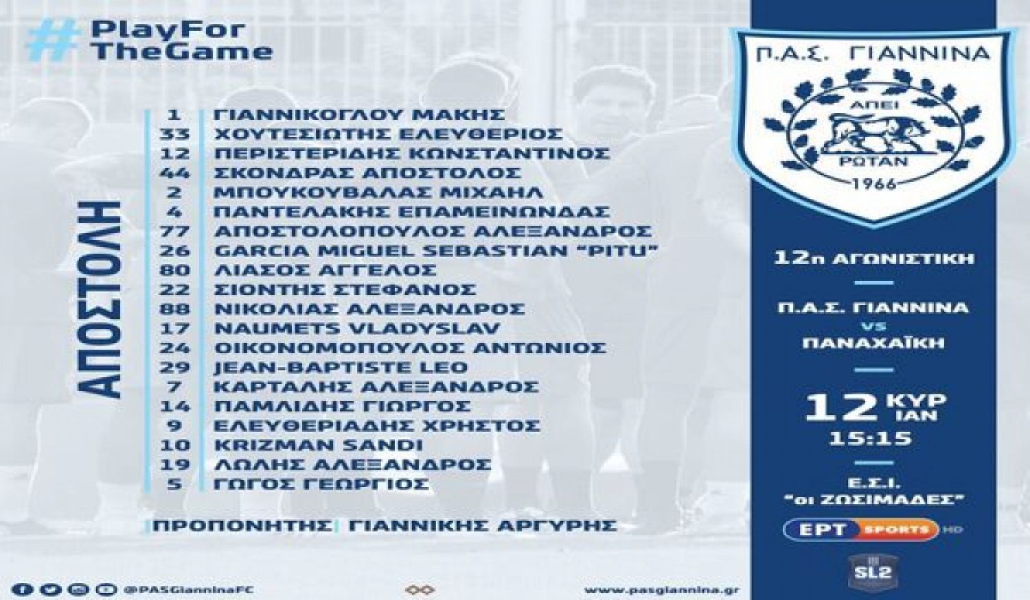 Ο προπονητής Αργύρης Γιαννίκης ανακοίνωσε την αποστολή του ΠΑΣ Γιάννινα ενόψει του αυριανού αγώνα με την Παναχαΐκή στο Ζωσιμάδες,με τον Χρήστο Ελευθεριάδη να είναι στους 20 ποδοσφαιριστές που ανακοίνωσε ο Τρικαλινός τεχνικός.