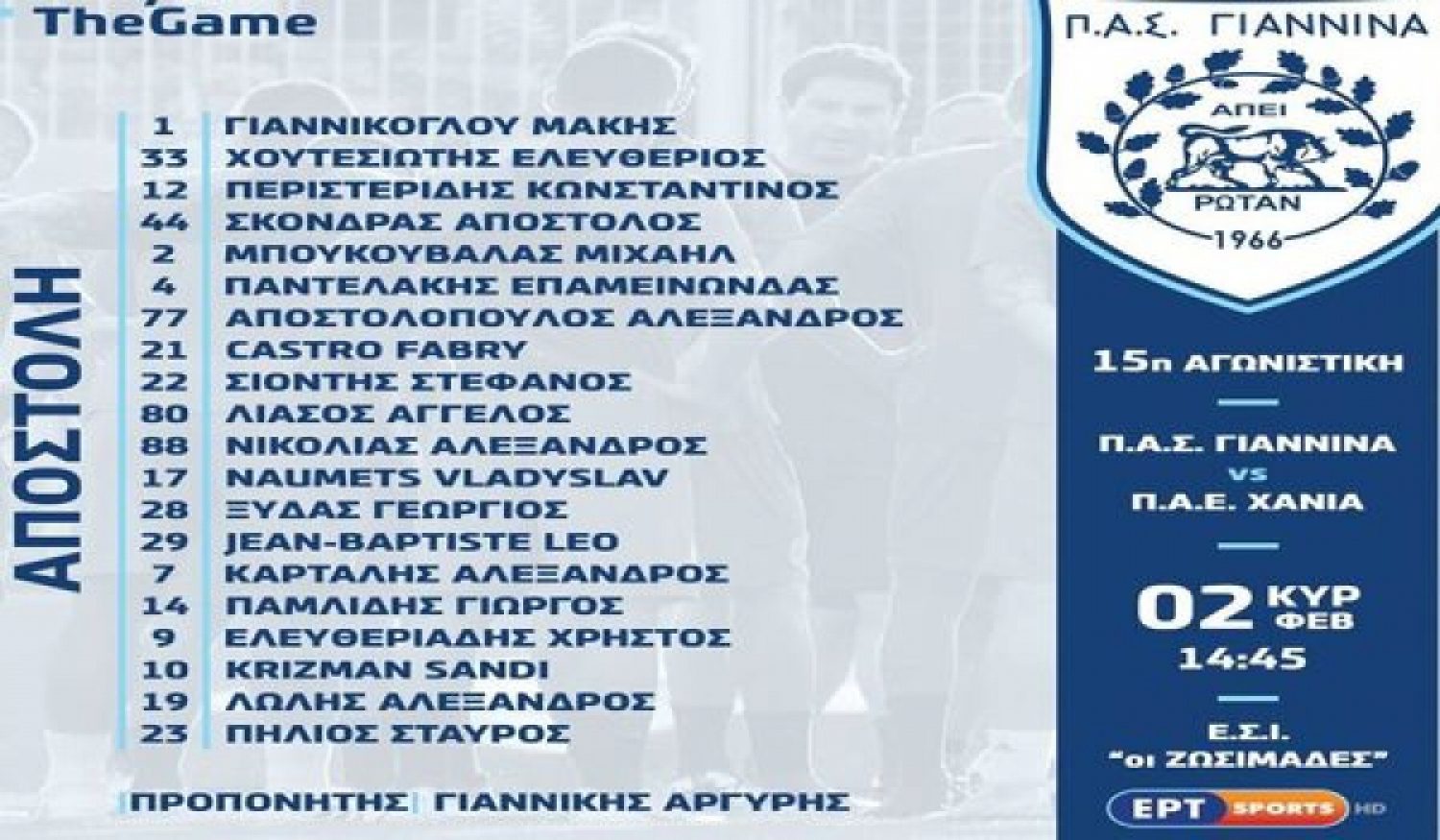Αναλυτικά την αποστολή του ΠΑΣ Γιάννινα αποτελούν οι: Χουτεσιώτης, Γιαννίκογλου, Περιστερίδης, Αποστολόπουλος, Μπουκουβάλας, Πήλιος, Σκόνδρας, Παντελάκης, Σιόντης, Λιάσος, Κάστρο, Λώλης, Καρτάλης, Νικολιάς, Νάουμετς, Ξύδας, Ελευθεριάδης, Παμλίδης, Λέο, Κρίζμαν.