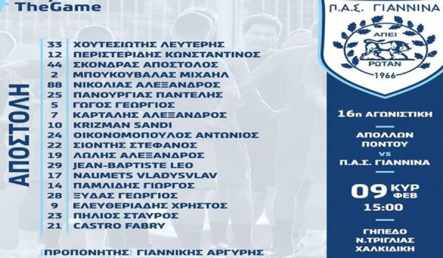 Για τη Θεσσαλονίκη ταξιδεύει σήμερα ο ΠΑΣ Γιάννινα καθώς αύριο το μεσημέρι (15:00) αντιμετωπίζει τον ουραγό Απόλλωνα Πόντου στο Δημοτικό Στάδιο Νέας Τρίγλιας Χαλκιδικής για την 16η αγωνιστική της Super League 2.