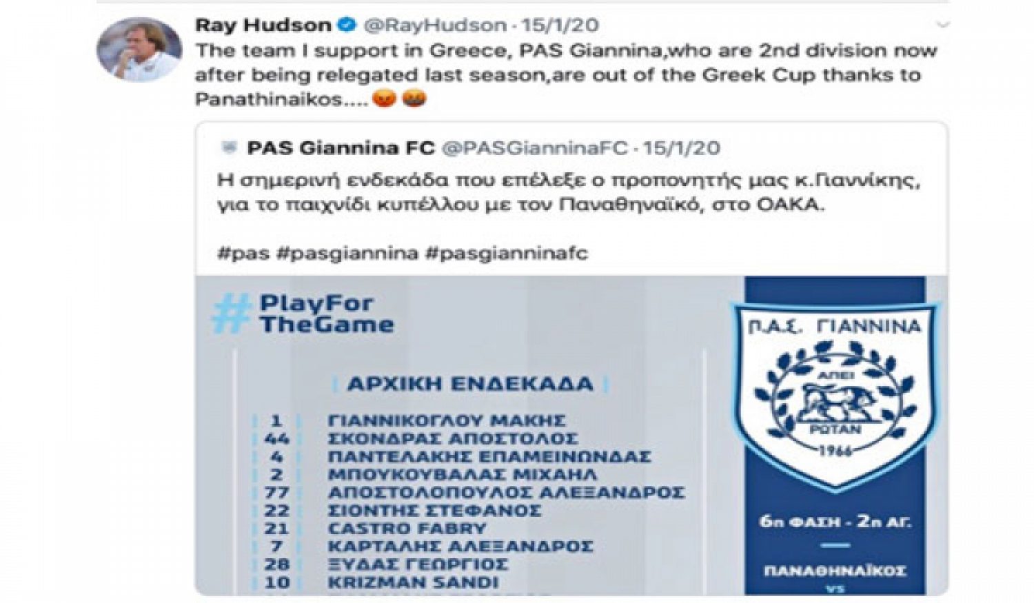 Με όλα τα παραπάνω στο μυαλό μου, δέχθηκα ένα ψυχαγωγικό σοκ τον περασμένο Ιανουάριο όταν τον είδα να γράφει στο twitter για την ελληνική ομάδα που υποστηρίζει! Ο Ray Hudson είναι οπαδός του ΠΑΣ Γιάννινα!