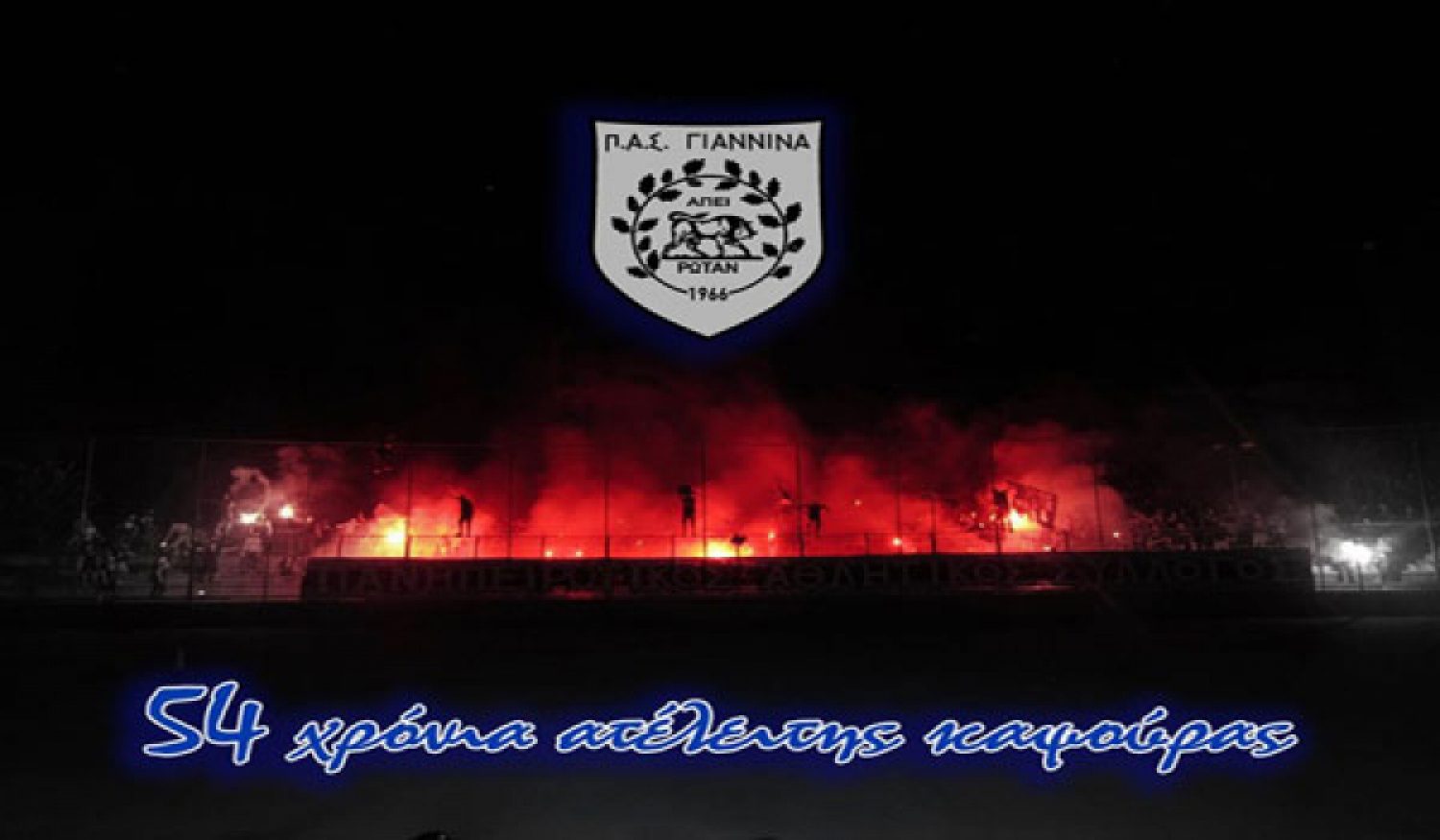 54 χρόνια ζωής συμπλήρωσε χθες ο ΠΑΣ Γιάννινα και ο Σ.Φ.ΠΑΣ Γιάννινα τίμησε την αγαπημένη του ομάδα με ένα φαντασμαγορικό σόου από πυρσούς που έκαναν τη νύχτα μέρα στο "Ζωσιμάδες"¨και στη θύρα που τόσα χρόνια δίνουν βροντερό παρών στηρίζοντας την προσπάθεια των παικτών του ΠΑΣ σε όποια κατηγορία και αν αγωνίζεται.