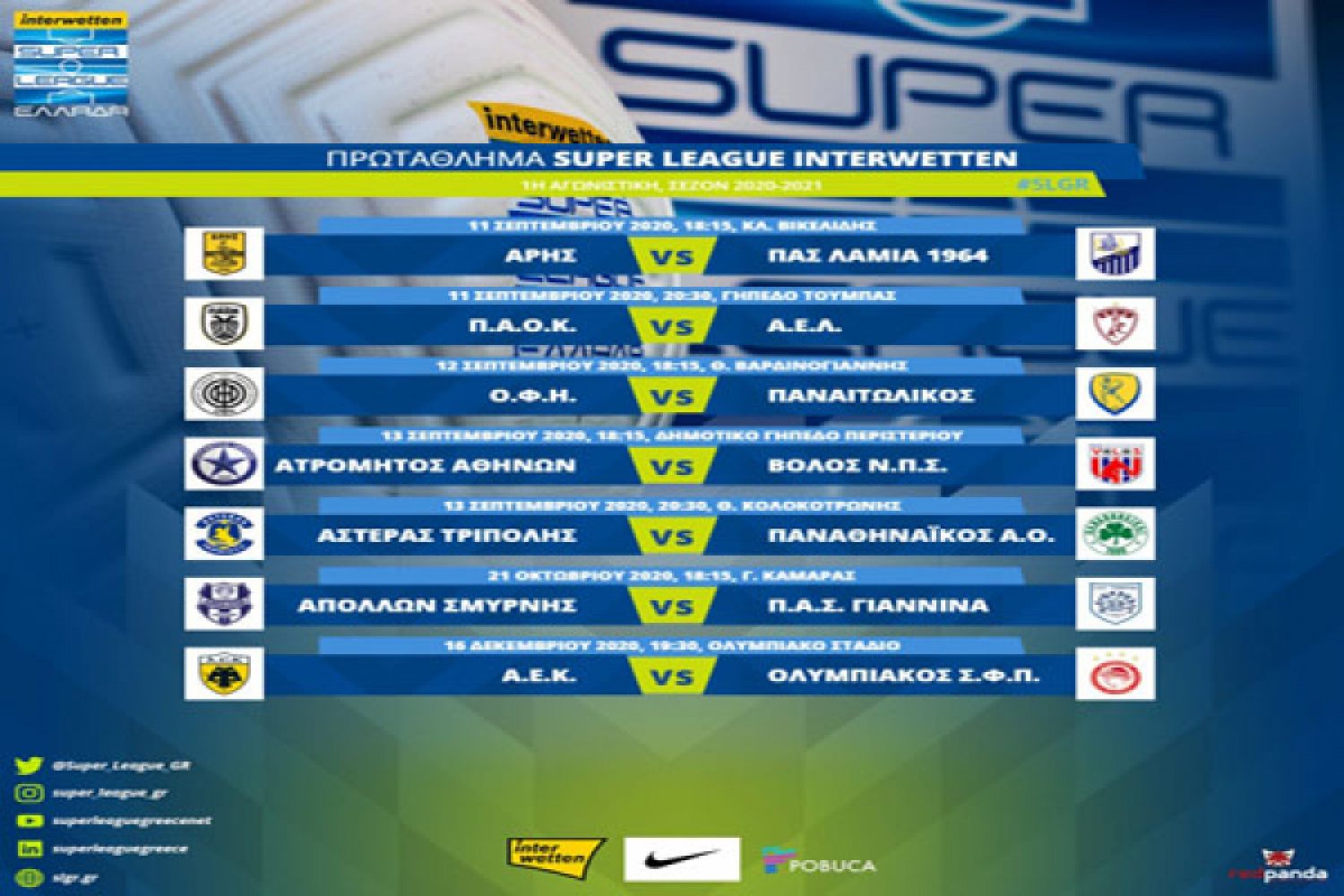 Στις 21 Οκτωβρίου (Γ, Καμάρας 18:15) ορίστηκε από τη Super League ο αγώνας της 1ης αγωνιστικής ανάμεσα στον Απόλλων Σμύρνης και τον ΠΑΣ Γιάννινα αφού μετά από αίτημα των δυο ομάδων οι αγώνες τους για τις τρεις πρώτες αγωνιστικές για το Απόλλωνα και για τις δυο πρώτες για τον ΠΑΣ Γιάννινα δεν θα διεξαχθούν.