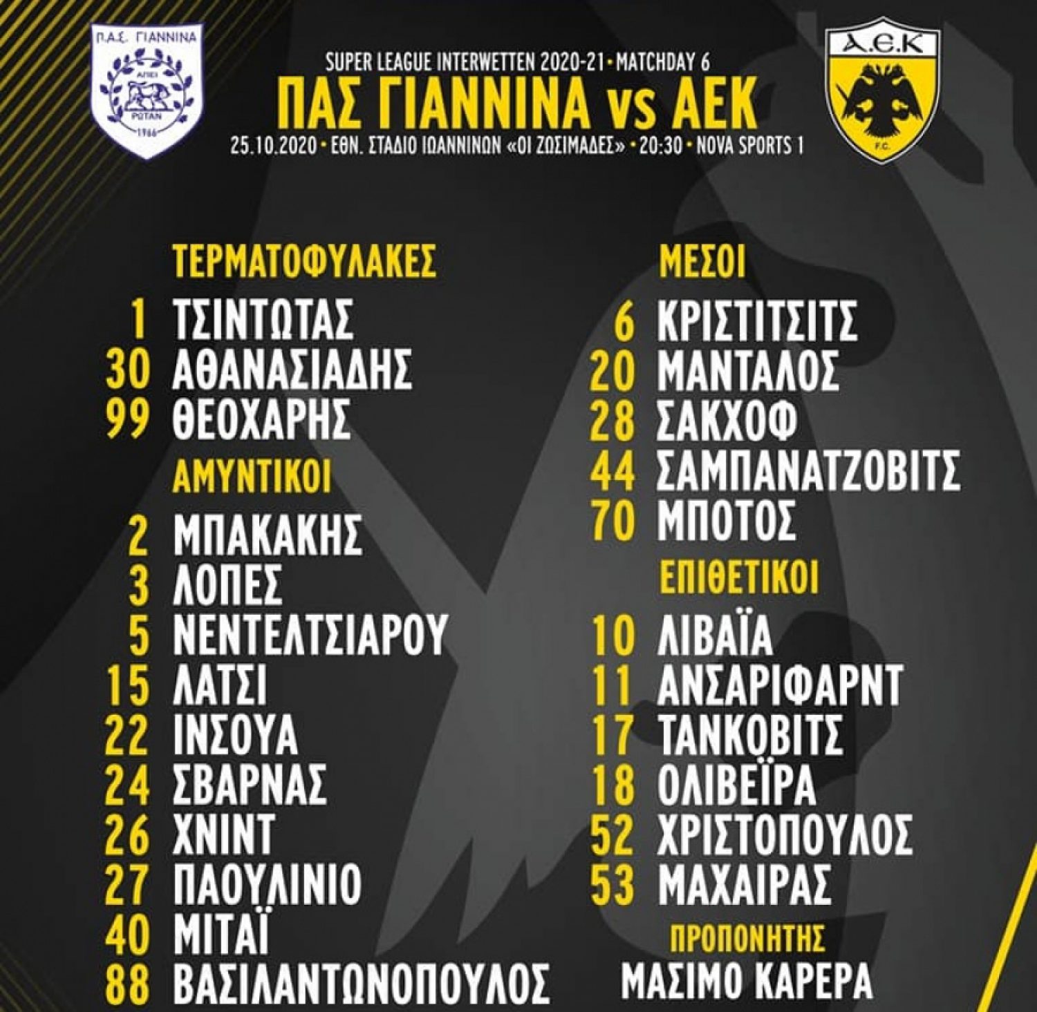 Εκτός αποστολής έμειναν ο Τσιγκρίνσκι λόγω ενοχλήσεων στο δεξιό δικέφαλο, αλλά και οι Σιμάνσκι, Λιβάι Γκαρσία, Γαλανόπουλος, Αλμπάνης, Σιμόες και Σαρδέλης. Η αποστολή της ΑΕΚ αναχώρησε πριν λίγο αεροπορικώς για τα Γιάννινα και θα καταλύσει σε κεντρικό ξενοδοχείο της πόλης των Ιωαννίνων.