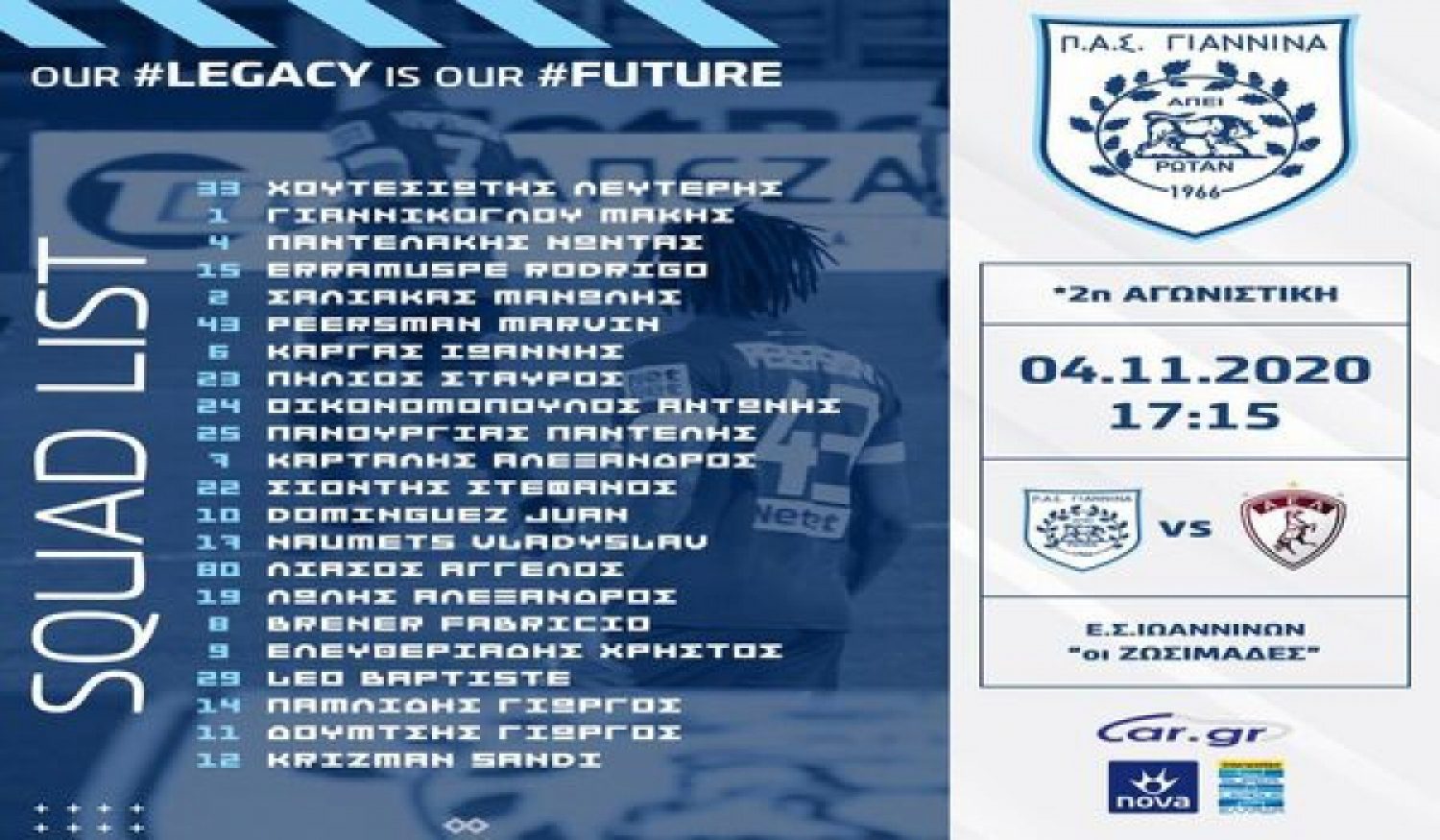 Αναλυτικά την αποστολή του ΠΑΣ Γιάννινα αποτελούν οι: Χουτεσιώτης, Γιαννίκογλου, Παντελάκης, Εραμούσπε, Σάλιακας, Πίρσμαν, Κάργας, Πήλιος, Οικονομόπουλος, Πανουργιάς, Καρτάλης, Σιόντης, Ντομίονγκεθ, Νάουμετς, Λιάσος, Λώλης, Μπρένερ, Ελευθεριάδης, Λεό, Παμλίδης, Δούμτσης και Κρίζμαν.