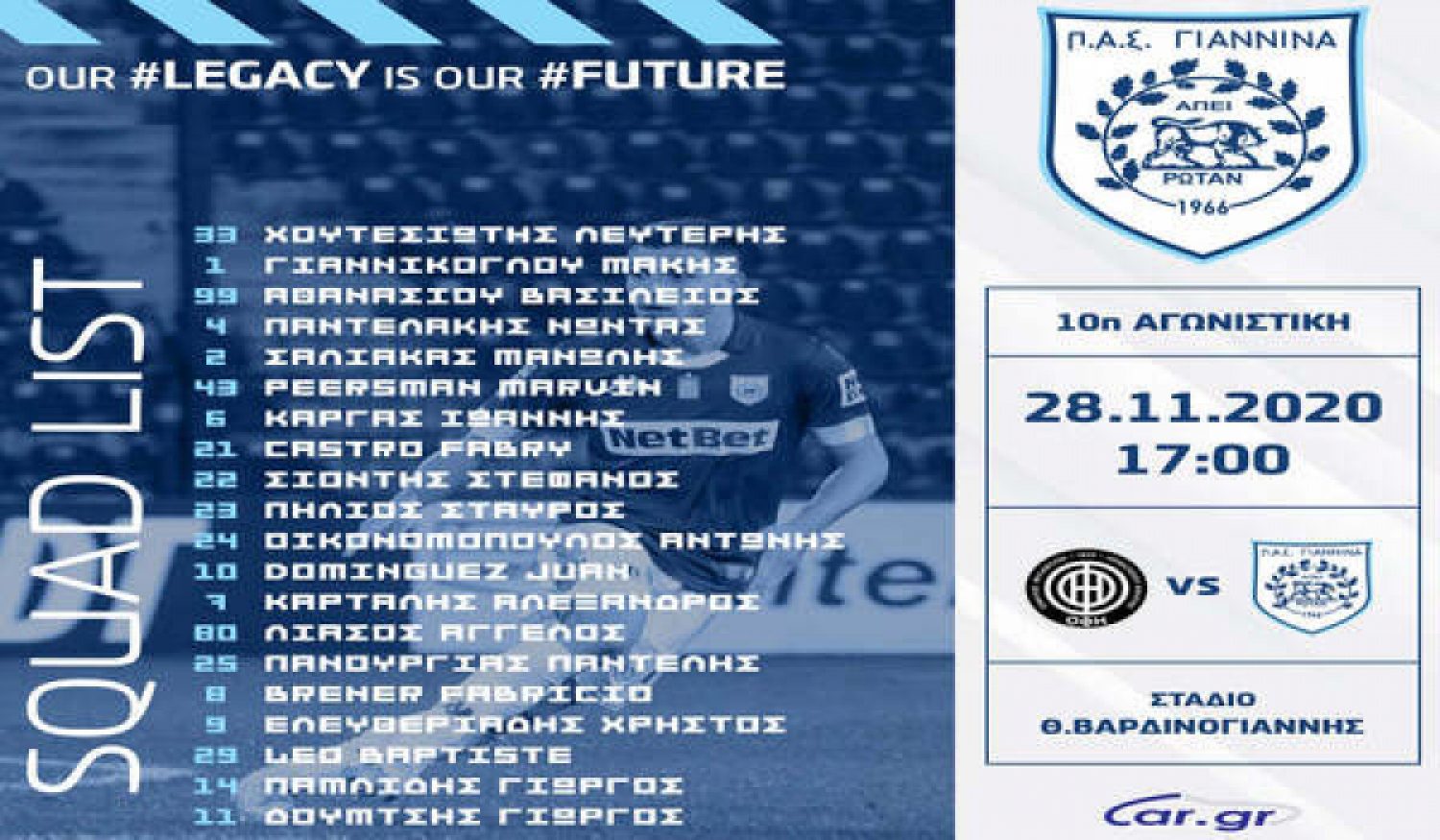 Αναλυτικά την αποστολή του ΠΑΣ Γιάννινα αποτελούν οι: Χουτεσιώτης, Γιαννίκογλου, Αθανασίου, Σάλιακας, Οικονομόπουλος, Πίρσμαν, Πήλιος, Κάργας, Παντελάκης, Πανουργιάς, Σιόντης, Κάστρο, Λιάσος, Ντομίνγκεθ, Καρτάλης, Μπρένερ, Ελευθεριάδης, Δούμτσης, Παμλίδης, Λέο.