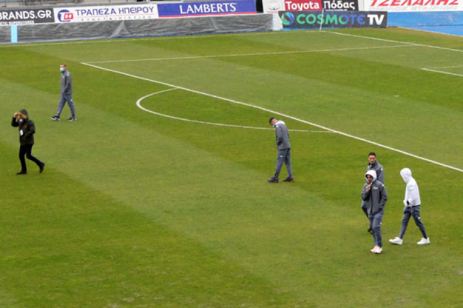-Βρέχει κατά διαστήματα με το γήπεδο ήδη να μην είναι σε καλή κατάσταση με τον διαιτητή Παπααδόπουλο και τους βοηθούς του να κάνουν έλεγχο για το αν μπορεί να διεξαχθεί ο αγώνας.