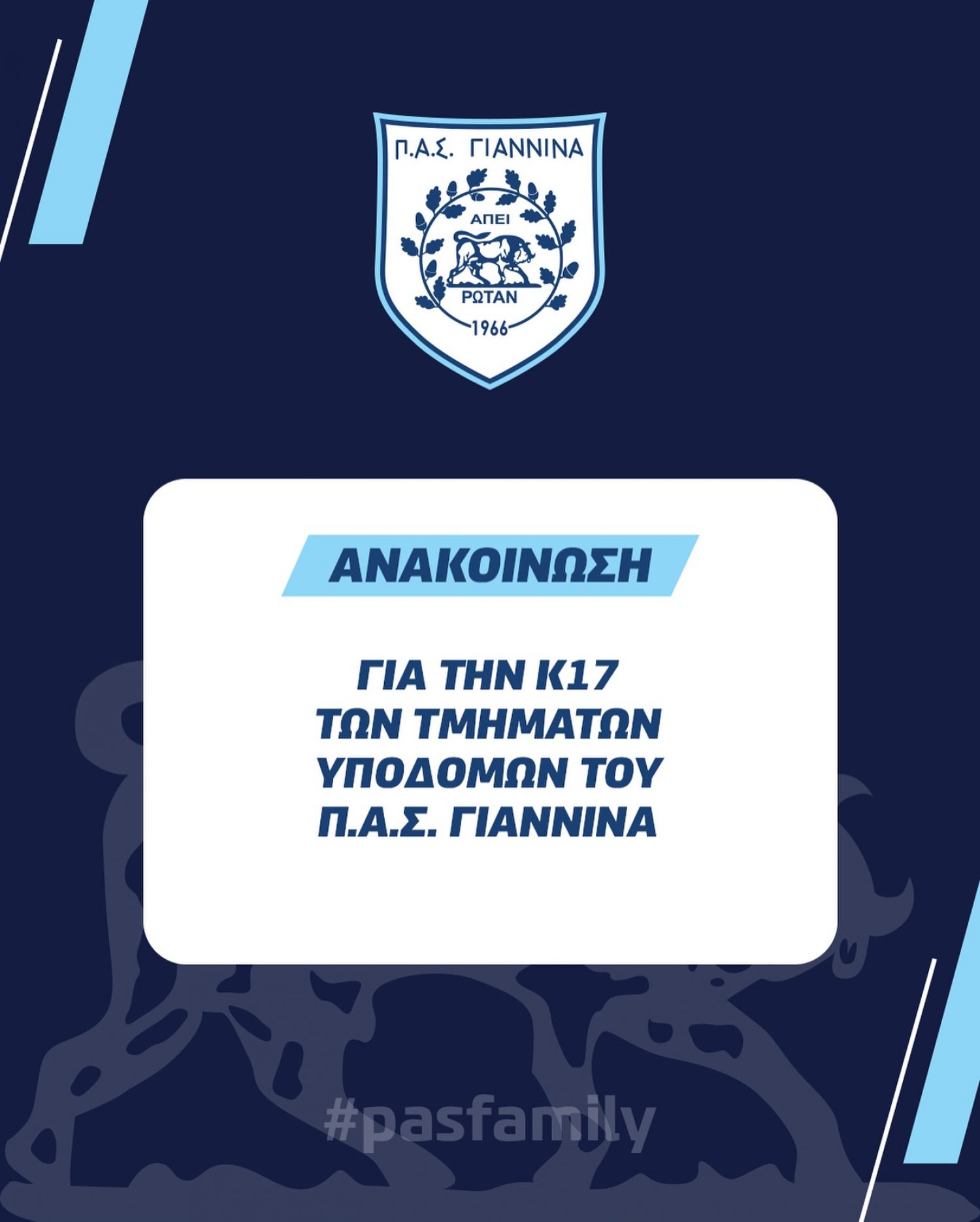 Στις 26 Οκτωβρίου θα κηρυχθεί η έναρξη του πρωταθλήματος της Κ17 της Super League 2 Ελλάδας με τον ΠΑΣ Γιάννινα να ετοιμάζεται για τη συμμετοχή του και να ανακοινώνει το τεχνικό τιμ και το ρόστερ.