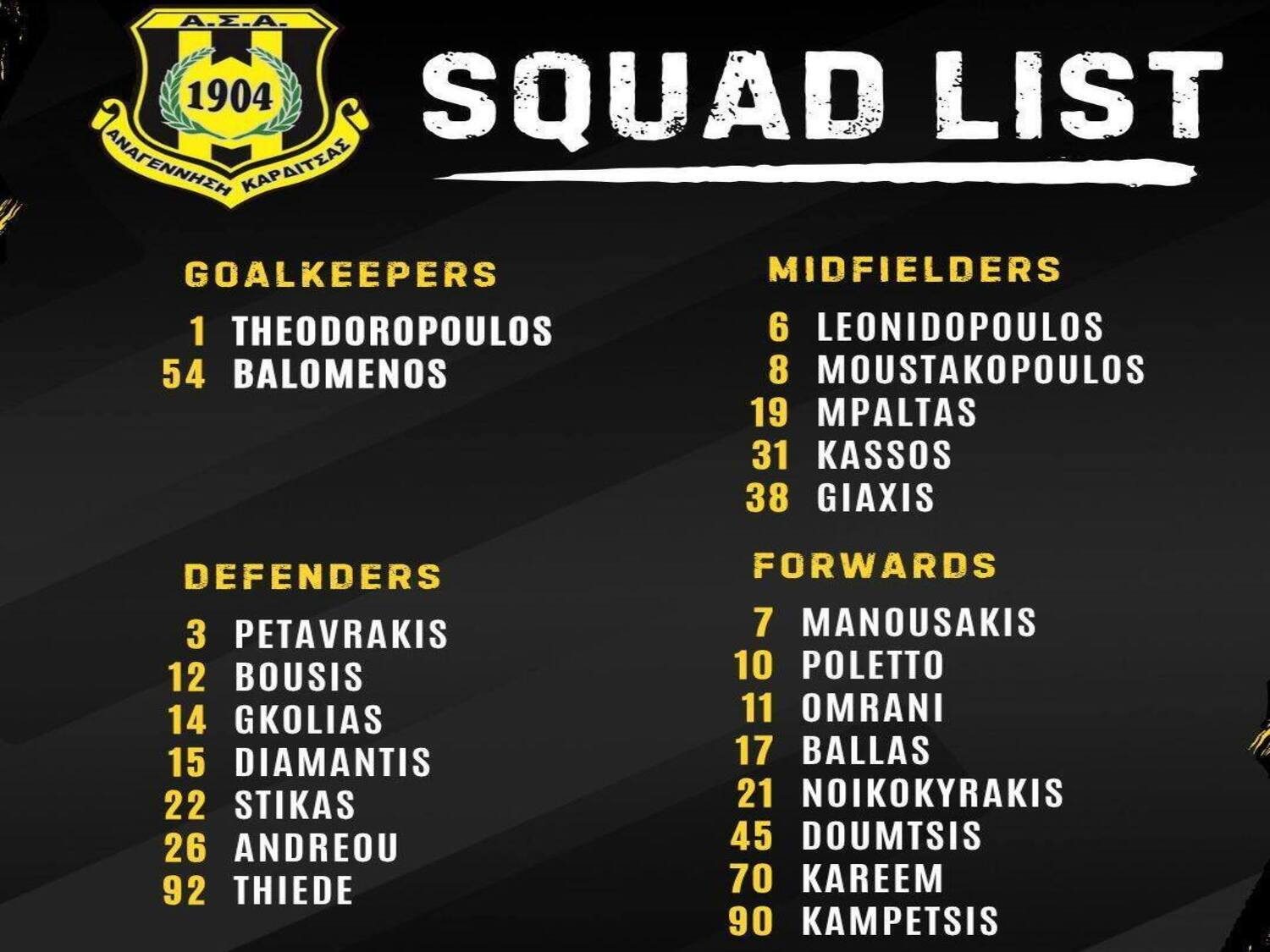 Αναλυτικά την αποστολή αποτελούν οι: Θεοδωρόπουλος, Μπαλωμένος, Πεταυράκης. Μπούσης, Γκόλιας, Διαμαντής, Στίκας, Ανδρέου, Τίντε, Λεωνιδόπουλος, Μουστακόπουλος, Μπαλτάς, Κάσσος, Γιαξής, Μανουσάκης, Πολέτο, Ομρανί, Μπάλλας, Νοικοκυράκης, Δούμτσης, Μπεν Κμαγιάλ, Καμπετσής.