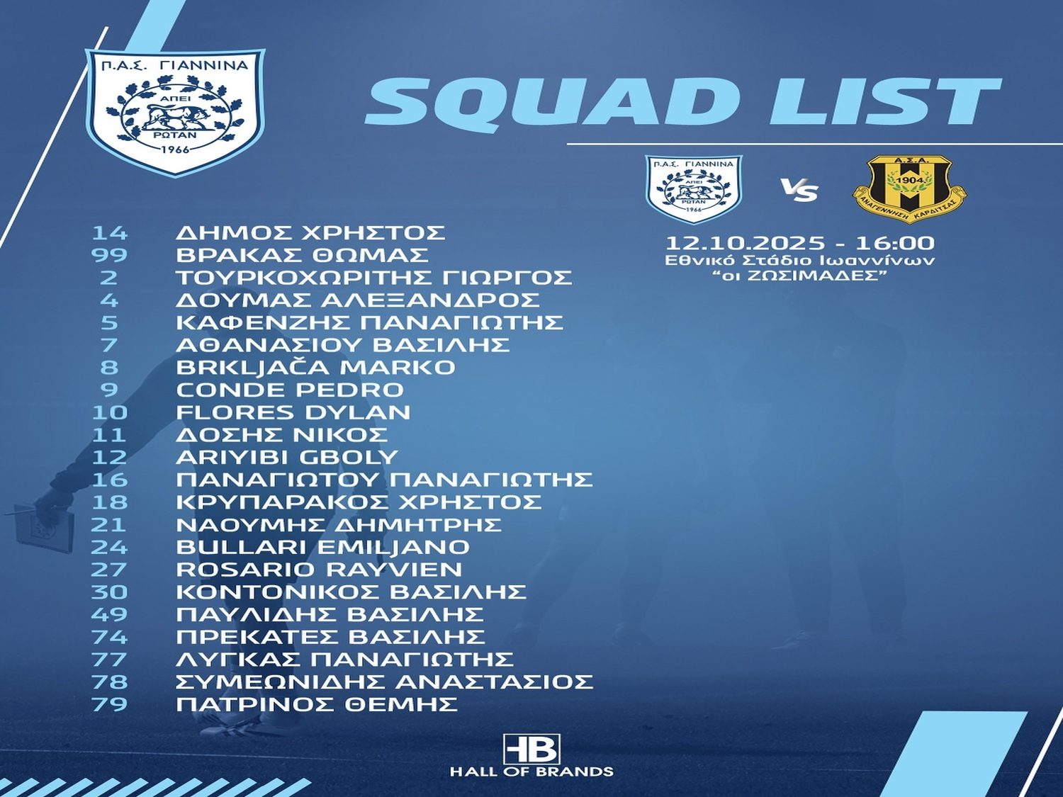 Τους 22 ποδοσφαιριστές που αποτελούν την αποστολή του ΠΑΣ Γιάννινα ενόψει της σημερινής αναμέτρησης στο "Ζωσιμάδες" με την Αναγέννηση Καρδίτσας για την 5η αγωνιστική του Α' ομίλου της Super League 2, ανακοίνωσε ο προπονητής Νίκος Κούστας. Στην 22άδα βρίσκεται και ο Ισπανός αρχηγός Πέδρο Κόντε προκειμένου να εμψυχώσει περισσότερο τους συμπαίκτες του ενόψει του σημερινού αγώνα.
