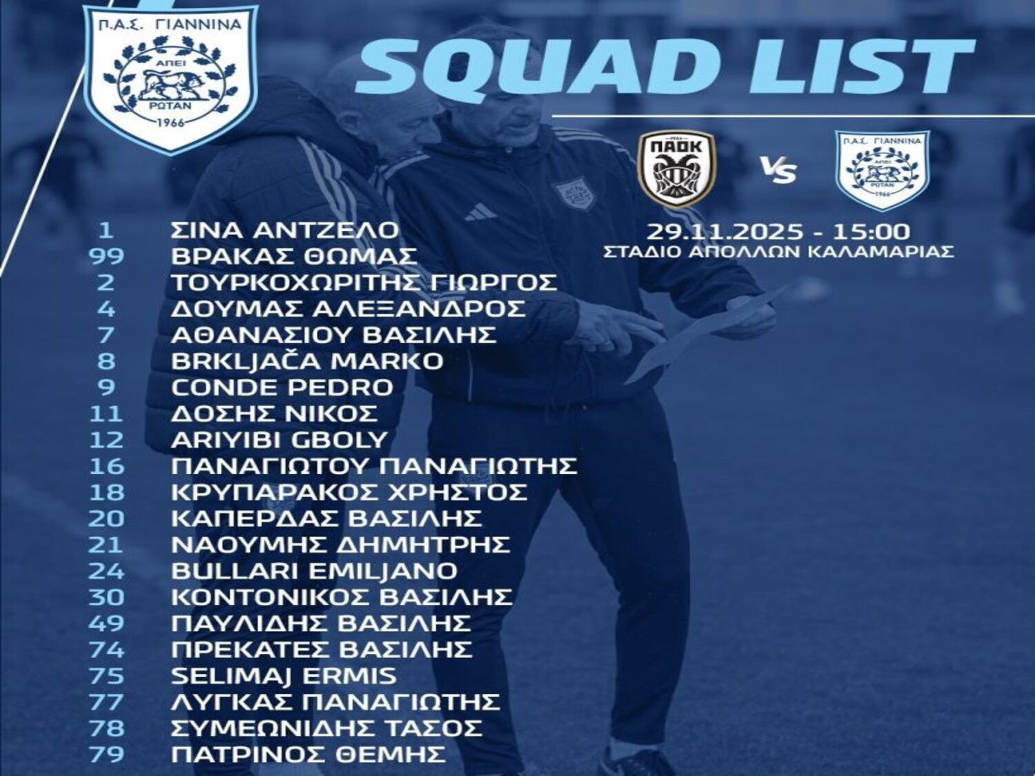 Χωρίς τους Ροζάριο και Φλόρες, αλλά με τον Παναγιώτου να επιστρέφει μετά την τιμωρία λόγω καρτών είναι η 21μελής αποστολή του ΠΑΣ Γιάννινα ενόψει του αυριανού (29/11, 15:00) αγώνα με τον ΠΑΟΚ Β' στη Θεσσαλονίκη για την 12η αγωνιστική της Super League 2.