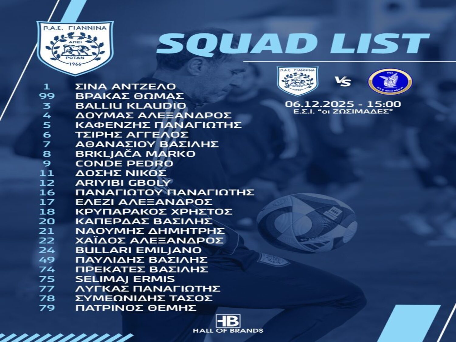 Μετά το τέλος της προπόνησης ο Λαρισαίος προπονητής του ΠΑΣ Γιάννινα, Γιάννης Γκούμας, ανακοίνωσε την αποστολή, στην οποία συμπεριελήφθησαν 24 ποδοσφαιριστές: Σίνα, Βρακάς, Μπαλίου, Δούμας, Καφενζής, Τσίρης, Αθανασίου, Μπρικλιάτσα, Κόντε, Δόσης, Αριγίμπι, Παναγιώτου, Ελέζι, Κρυπαράκος, Καπέρδας, Ναούμης, Χάιδος, Μπουλάρι, Παυλίδης, Πρεκατές, Σελιμάι, Λύγκας, Συμεωνίδης και Πατρινός.
