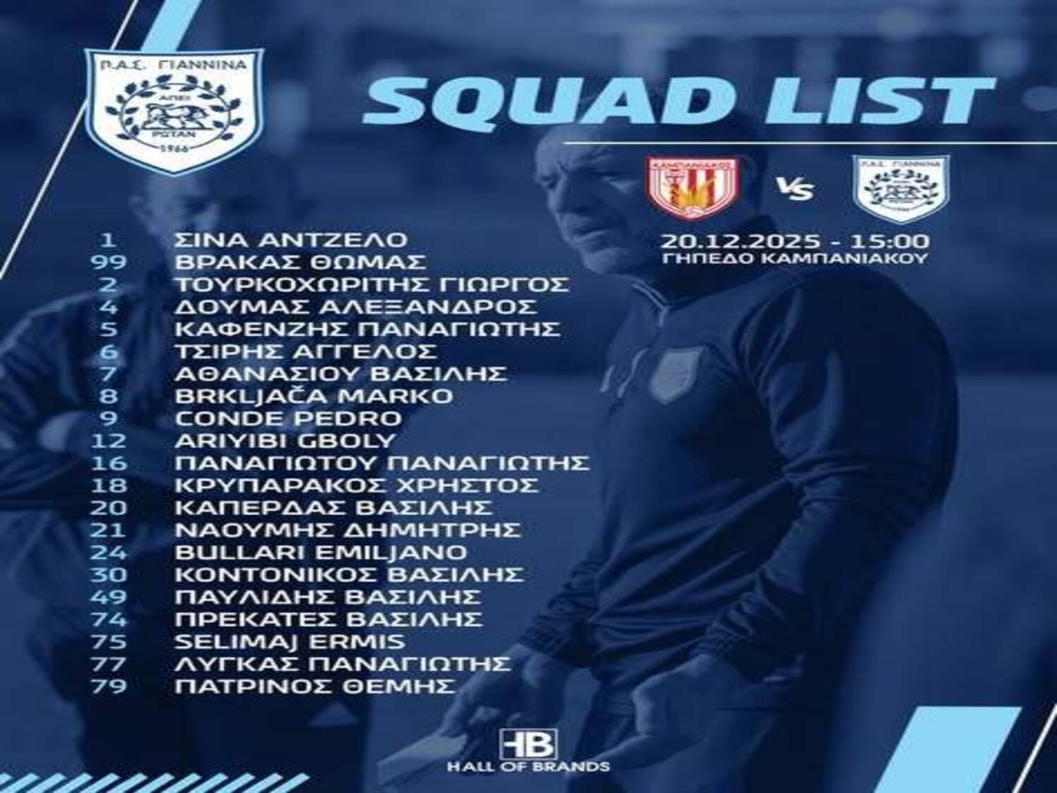 Mε μια μεσημεριανή προπόνηση στις εγκαταστάσεις του ΠΕΑΚΙ, ολοκληρώθηκε η προετοιμασία στον ΠΑΣ Γιάννινα για τον αυριανό (15.00) αγώνα με αντίπαλο τον Καμπανιακό στη Χαλάστρα για την 15η αγωνιστική της Super League 2. Mετά το τέλος της προπόνησης, ο Γιάννης Γκούμας ανακοίνωσε την 21 μελή αποστολή, από την οποία απουσιάζει ο τραυματίας Τάσος Συμεωνίδης.