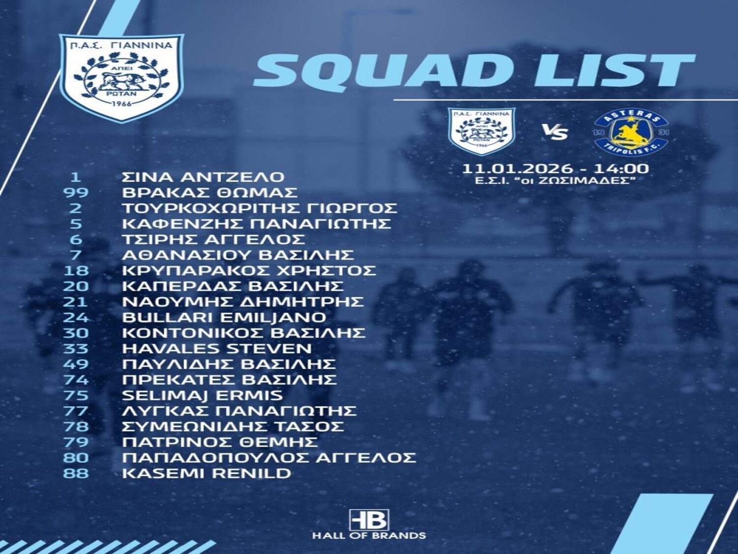 Ο Γιάννης Γκούμας θα έχει στη διάθεση του 20 ποδοσφαιριστές, τους: Σίνα, Βρακά, Τουρκοχωρίτη, Καφενζή, Τσίρη, Αθανασίου, Κρυπαράκο, Καπέρδα, Ναούμη, Μπουλάρι, Κοντονίκο, Χαβαλές, Παυλίδη, Πρεκατέ, Σελιμάι, Λύγκα, Συμεωνίδη, Πατρινό, Παπαδόπουλο και Κασέμι.