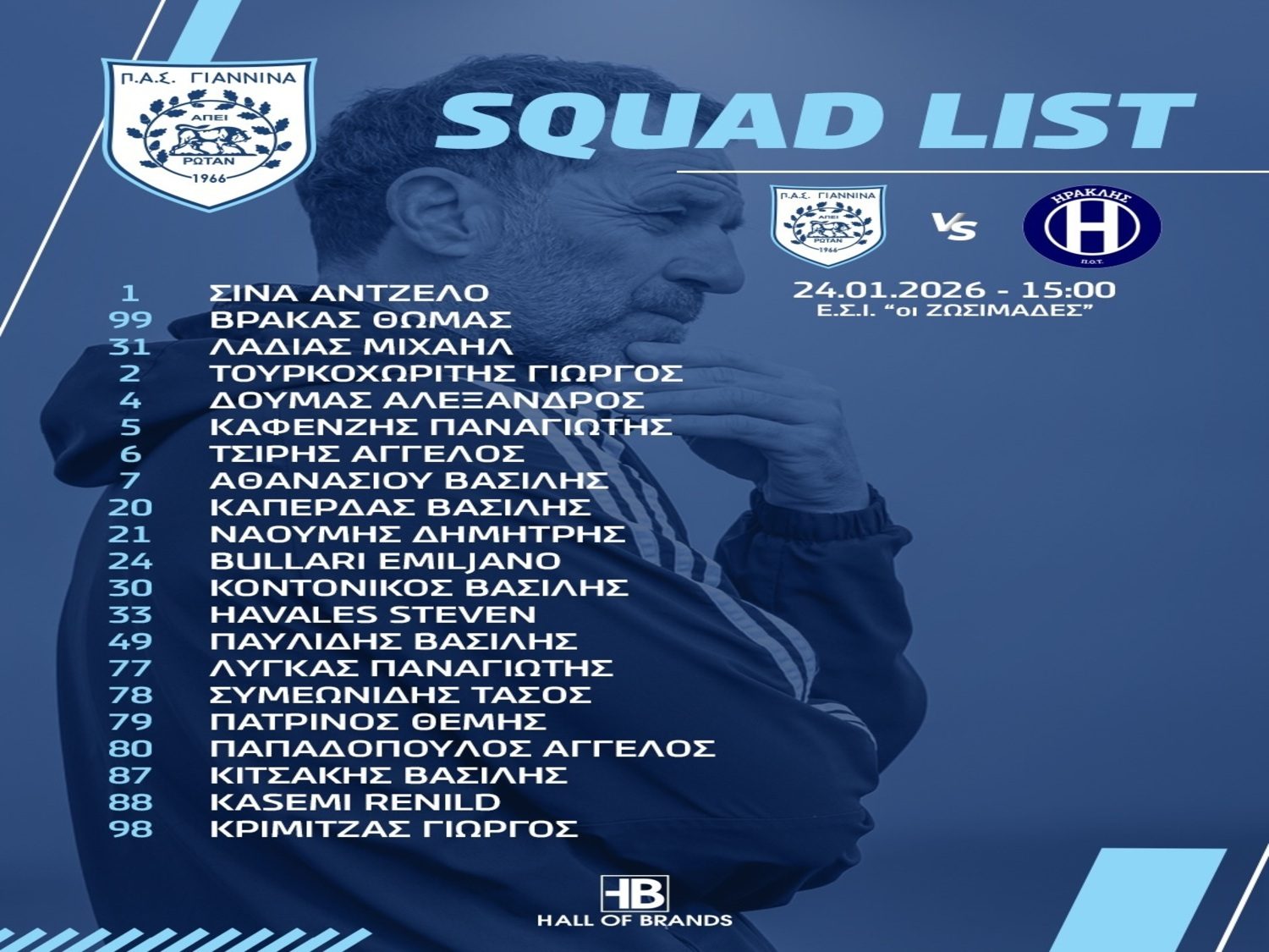 Μετά το τέλος της προπόνησης, ο τεχνικός Γιάννης Γκούμας, ανακοίνωσε την αποστολή για τον αγώνα και πιο συγκεκριμένα θα έχει μαζί του 21 ποδοσφαιριστές, δηλαδή τους Σίνα, Βρακά, Λαδιά, Τουρκοχωρίτη, Δούμα, Καφενζή, Τσίρη, Αθανασίου, Καπέρδα, Ναούμη, Μπουλλάρι, Κοντονίκο, Χαβαλές, Παυλίδη, Λύγκα, Συμεωνίδη, Πατρινό, Παπαδόπουλο, Κιτσάκη, Κασέμι και Κριμιτζά.