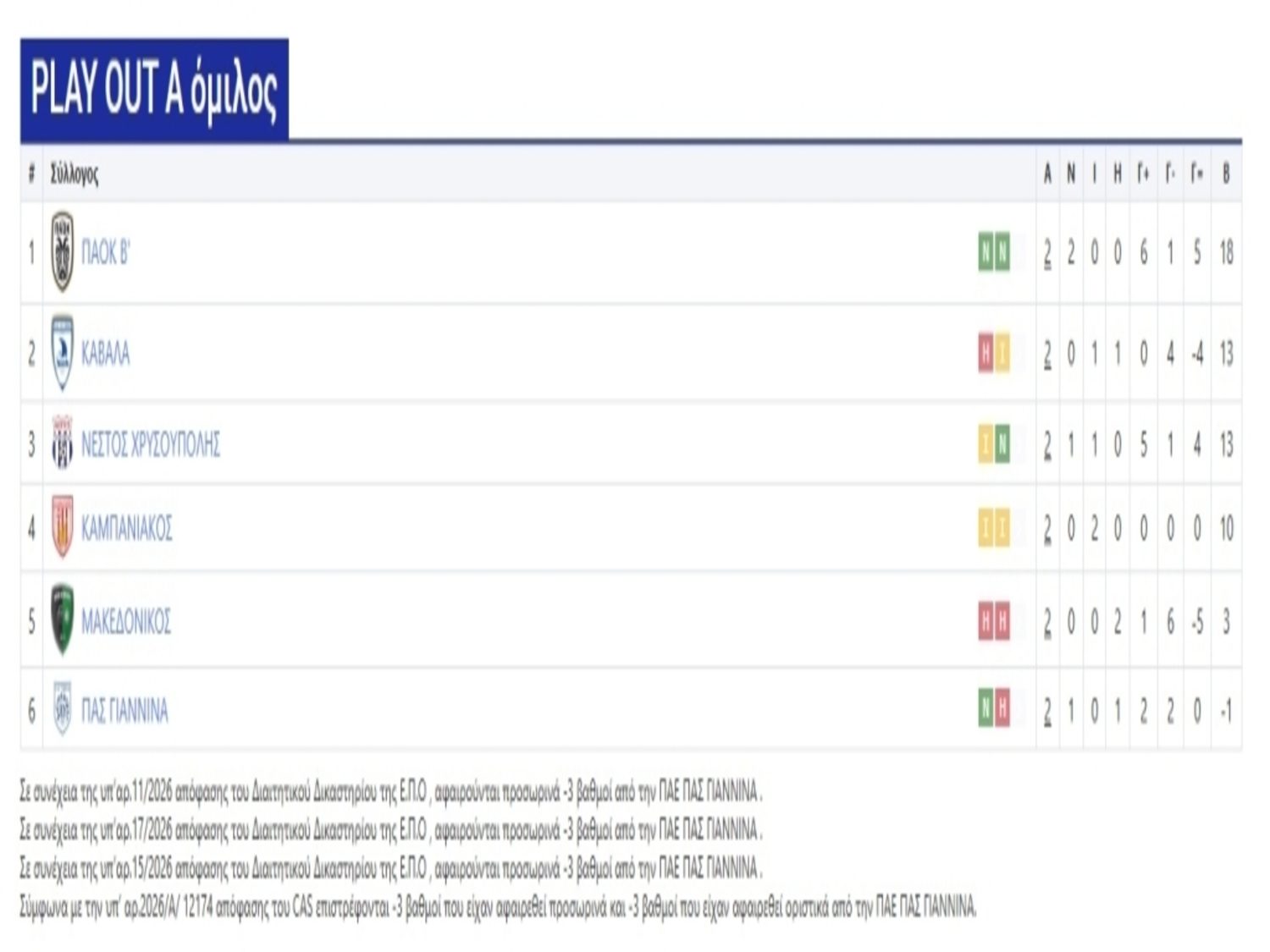 Σε συνέχεια της υπ’αρ.17/2026 απόφασης του Διαιτητικού Δικαστηρίου της Ε.Π.Ο , αφαιρούνται προσωρινά -3 βαθμοί από την ΠΑΕ ΠΑΣ ΓΙΑΝΝΙΝΑ .