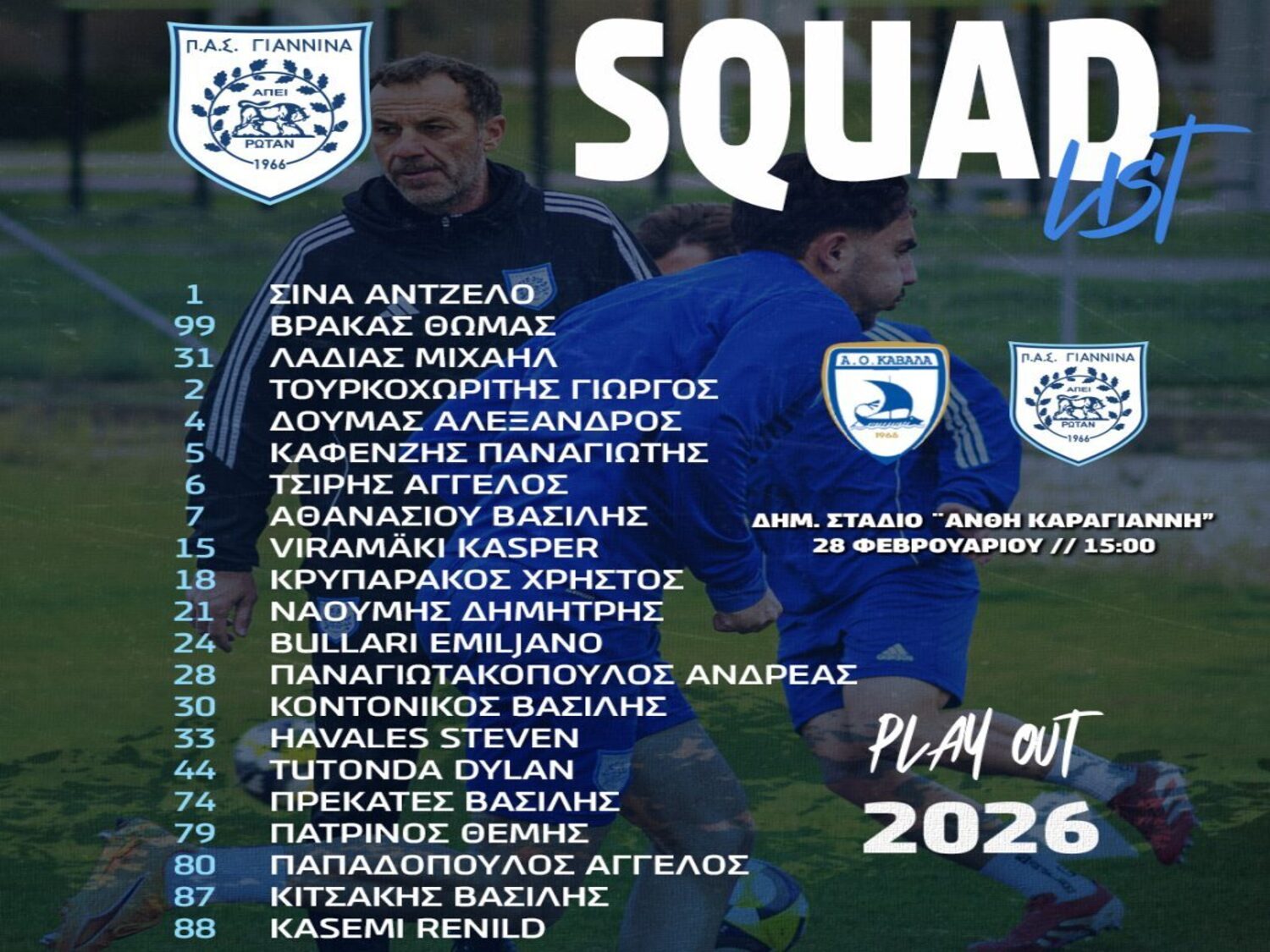 Χωρίς τους τραυματίες Φιόγκμπε, Κριμιτζά και τον ανέτοιμο Σελιμάι αλλά με 21 παίκτες στη διάθεση του Γιάννη Γκούμα, αναχώρησε για την Καβάλα η αποστολή του ΠΑΣ Γιάννινα ενόψει του αυριανού αγώνα (15.00 /Mega news) για την 3η αγωνιστική των Play Out του Α’ ομίλου της Super League 2.
