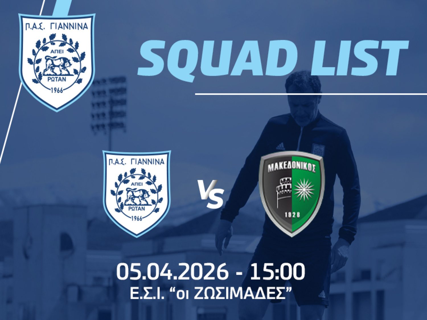 Με τους Κάντας Φιόγκμπε και Ναούμη να επιστρέφουν και συνολικά 23 ποδοσφαιριστές, όχι όμως τους Κρυπαράκο και Χαβαλέ, είναι η αποστολή του ΠΑΣ Γιάννινα ενόψει της αυριανής αναμέτρησης με αντίπαλο τον Μακεδονικό στο "Ζωσιμάδες" για την 6η αγωνιστική των Play Out της Super League 2.