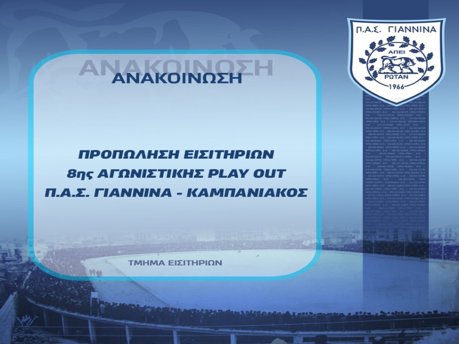 Οι τιμές των εισιτηρίων για τον εντός έδρας αγώνα των PLAY OUT με τον Καμπανιακό, την Κυριακή 26 Απριλίου 2026 – 15.00.