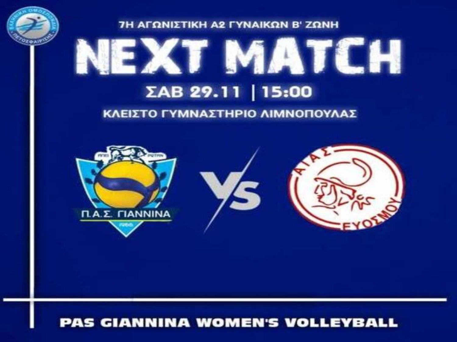 Για την 7η αγωνιστική της Β' Ζώνης της Α2 Γυναικών στο Βόλεϊ, ο ΠΑΣ Γιάννινα υποδέχεται στις 15.00 τον Αίαντα Ευόσμου στο Κλειστό της Λιμνοπούλας, με στόχο την πρώτη νίκη. Η ομάδα της Μαρίας Μπράγια μετά από ένα κακό ξεκίνημα στην Α2, πήρε από ένα βαθμό στα δυο τελευταία ματς με Μακεδόνες και Νίκη Αλεξανδρούπολης.