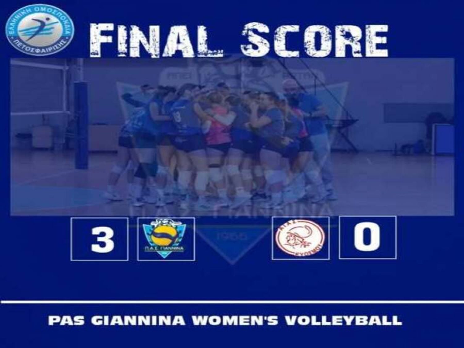 Tην πρώτη της νίκη στο πρωτάθλημα της Α2 Εθνικής Βόλεϊ, πέτυχε η γυναικεία ομάδα του ΠΑΣ Γιάννινα που επικράτησε με 3-0 σετ στο παιχνίδι με τον Αίαντα Ευόσμου που έγινε το μεσημέρι του Σαββάτου στο Κλειστό της Λιμνοπούλας. Οι φίλαθλοι του ΠΑΣ έδωσαν το παρών σε ακόμη ένα παιχνίδι, δεν σταμάτησαν λεπτό να εμψυχώνουν τις παίκτριες της Μαρίας Μπράγια και τις οδήγησαν στο άνετο και πολυπόθητο αποτέλεσμα.