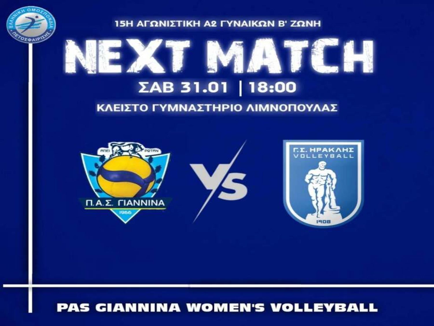Για την 15η αγωνιστική της Β' Ζώνης της Α2 Βόλεϊ των Γυναικών, ο ΠΑΣ Γιάννινα φιλοξενεί σήμερα στις 18.00 στη Λιμνοπούλα τον δεύτερο της βαθμολογίας Ηρακλή. Μετά την ΕΑ Λάρισας, η ομάδα της Μαρίας Μπράγια θα αντιμετωπίσει ακόμη ένα δυνατό αντίπαλο.